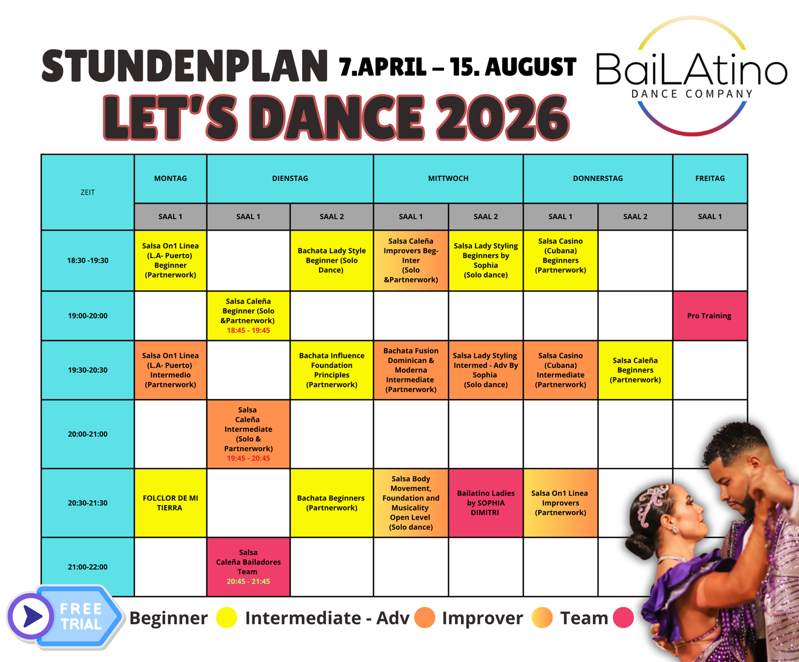 Desde lecciones grupales hasta lecciones privadas, desde coreografías de bodas hasta cursos en línea, ofrecemos algo para todos los niveles e intereses. ¡Ven a nosotros y déjate llevar por el ritmo del baile latino!